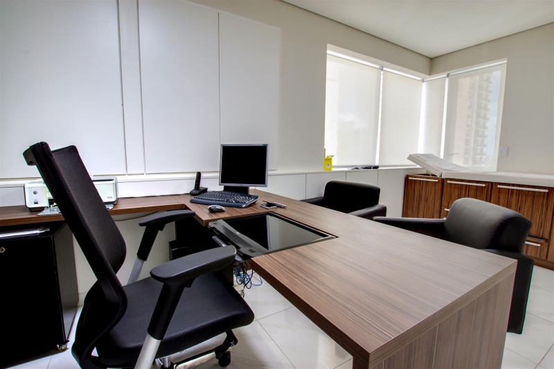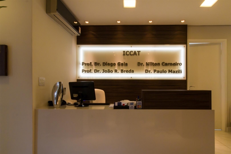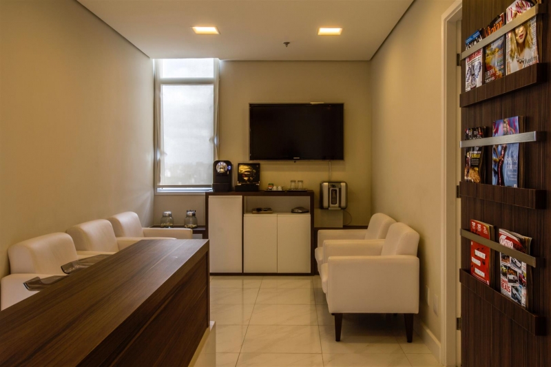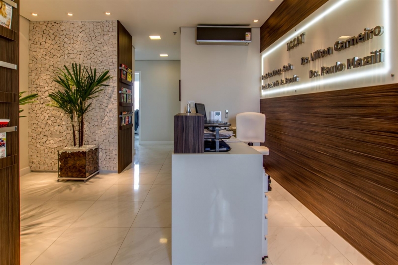 Especial atenção a recepção e espera com aplicação de mosaico português, madeira e mármore deixando um ambiente mais amplo e agradável ao cliente.